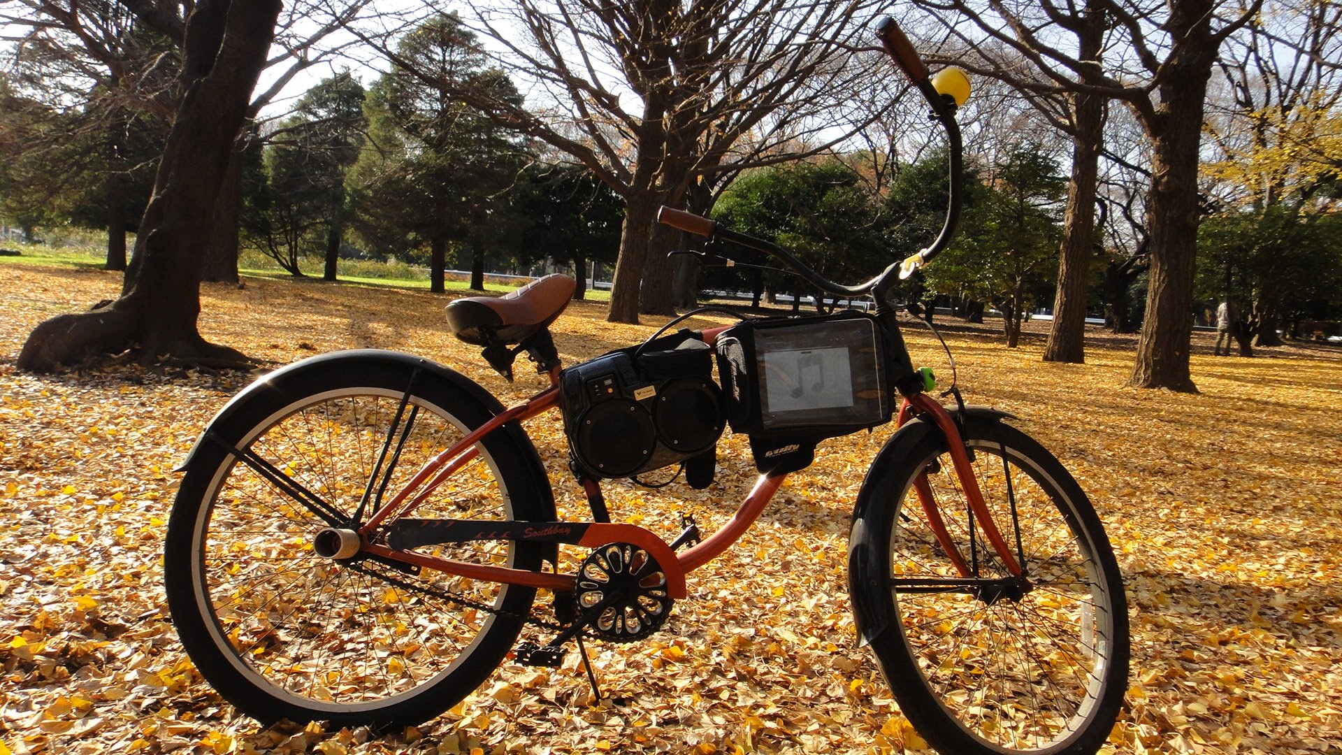 ビーチクルーザーに工作用バッテリーとスピーカー取り付けて、バイク用タンクバックの透明部分にiPad入れてビジュアライザ再生して。
